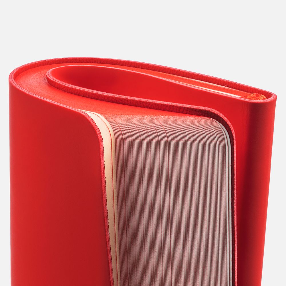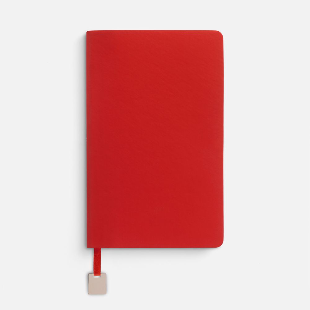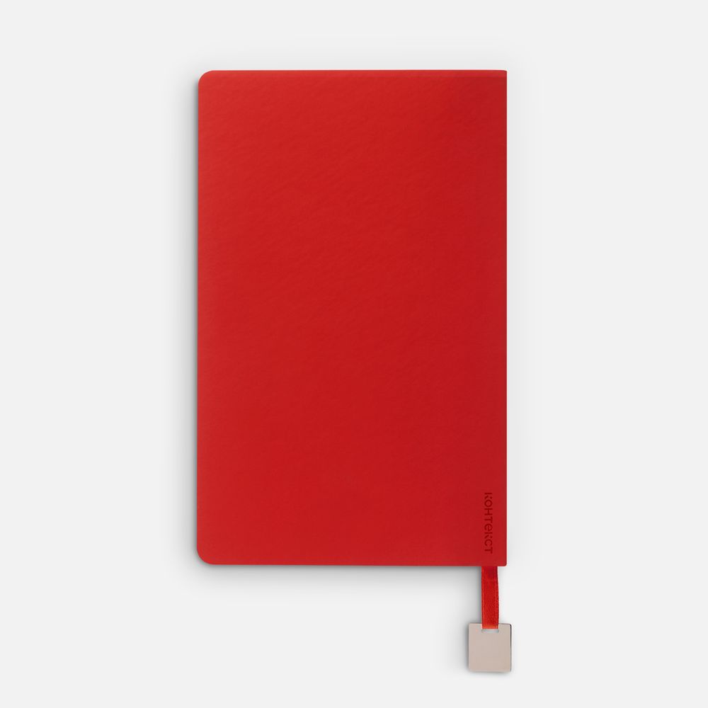 Ежедневник с гибкой обложкой, выполнен из материалов Soft Touch Ultra, красный РР, и Latte, красный (внутренняя часть обложки), дополнен ляссе в цвет обложки с металлическим шильдиком.