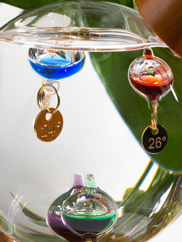 Термометр Галилео оригинальной формы, напоминающей глобус, добавит индивидуальности домашнему или офисному интерьеру. В основе его работы лежит физическая закономерность, впервые отмеченная великим Галилео Галилеем: плотность жидкости увеличивается при снижении температуры и уменьшается при ее повышении. И теперь стеклянные шарики в жидком парафине не только радуют глаз, но и позволяют с легкостью определить температуру в помещении.